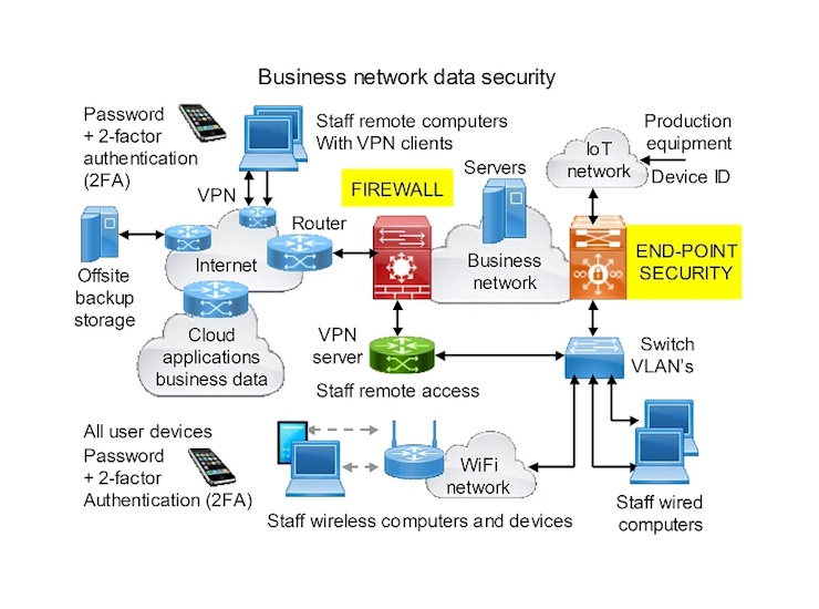 An important security feature is called zero-trust. This means that user devices are not allowed to connect to the network until the device has been authenticated and the user has been authenticated using multi-factor authentication (MFA). This will reduce the possibility that a device infected with a Trojan virus is connected to the business network. To protect the network users devices should not be permitted to connect to other networks that have no cybersecurity protection. User devices are connected through an end-point firewall that will authenticate devices and users using 2-factor authentication.